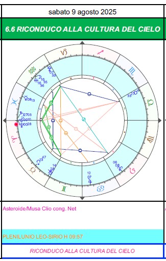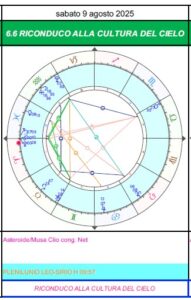nel Cielo eliocentrico, delle cause, Nettuno, Dio delle Acque, Signore Custode della Comunione infinita nutrita dalla volontà della Sua energia di Sesto Raggio dell’Idealismo astratto e Devozione, è raggiunto dall’Asteroide 84*** assimilato alla Musa Clio: indicata come «protettrice delle acque sacre» (l’acqua ha per nota chiave la sintesi unificante ed è l’elemento che ricorda), Clio è considerata la Musa della storia che celebra il riconoscimento del valore degli altri e ricorda che bisogna dare valore al Bene (atti eroici e generosi) e conoscere le lezioni del passato, per procedere e costruire sapientemente il Futuro individuale e comune.