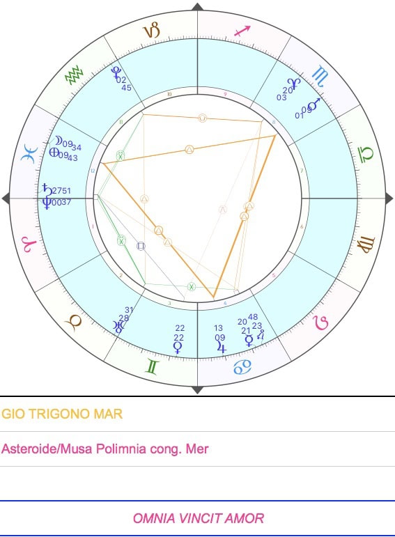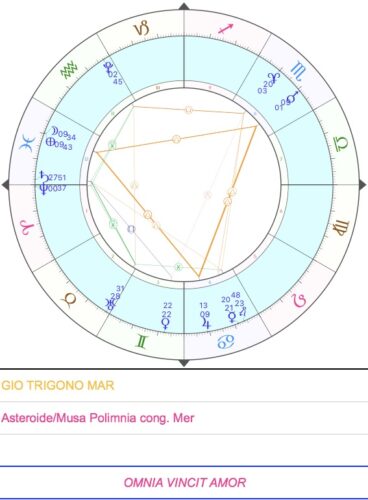 Nel cielo di oggi il sublime Mercurio, il divino Artista, Signore del Centro ed acceleratore dell’Evoluzione, che ispira in tutti i cuori del Sistema l’anelito ad imitare il Modello celeste, si congiunge – nel segno di Cancer, la cui Luce interiore illumina il mare della vita ed è inestinguibile – a Polimnia, Colei che ha molti Inni, Musa della danza e del canto corale sacri e rituali, quindi Musa della sacralità ritmica e dell’intimità solenne. Il loro volo congiunto ci ricorda l’importanza del potere del ritmo, di cui Polimnia è simbolo eccelso, al servizio della contemplazione e riflessione del Modello. Solo attraverso la solennità e la sacralità del vero Amore è possibile entrare in profonda risonanza con le leggi, i principi e i valori della dimensione trascendente e manifestarli su tutti i piani nella vita quotidiana; sono le chiavi per essere dei Costruttori di Armonia, in grado di fare delle loro stesse vite delle opere d’Arte!