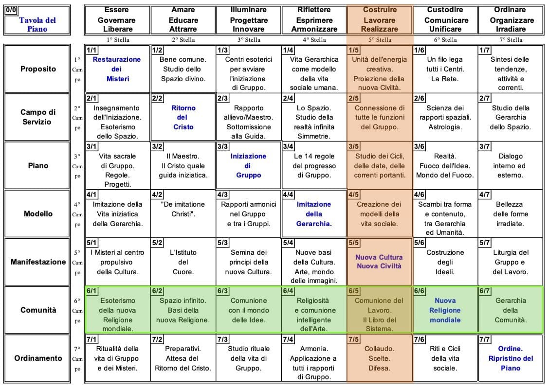 L’Officina del Pensiero di TPS semina “Idee, Formule e Forme per una nuova Cultura e Civiltà” seguendo in Alto la Ritualità dei segni e ritmi del Cielo, e rapportandoli in Basso alle battute annuali della prima formulazione umana del Piano planetario a 49 Mete (vedi i testi Attestare il Piano planetario e il Lavoro soggettivo del Prototipo dell’Ordine Planetario).